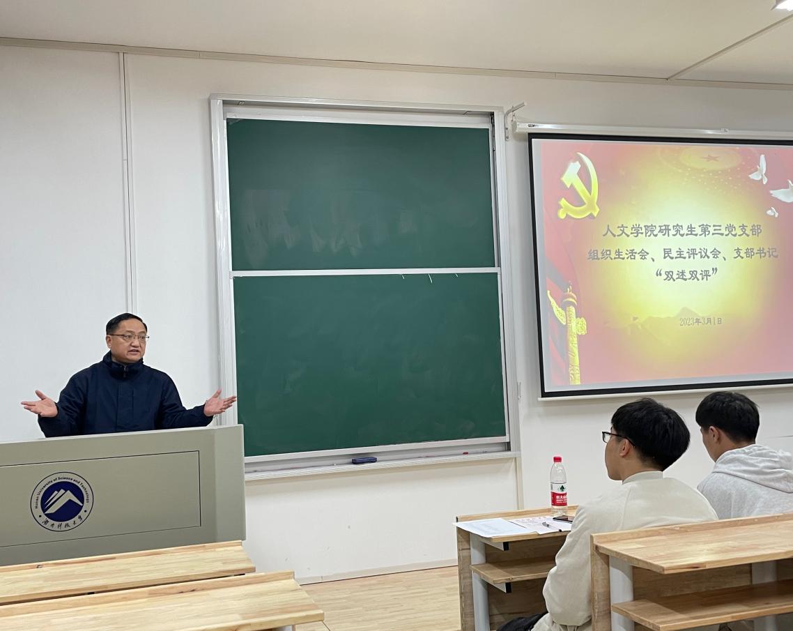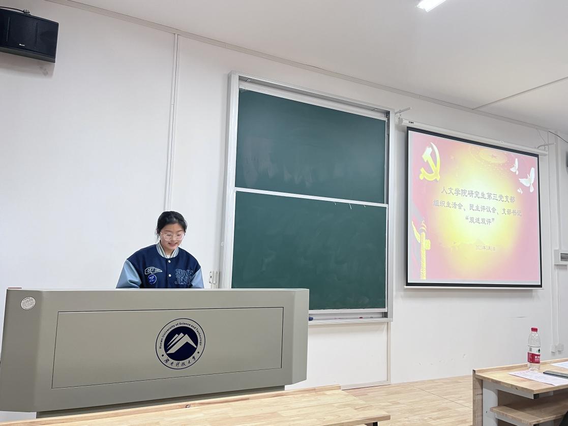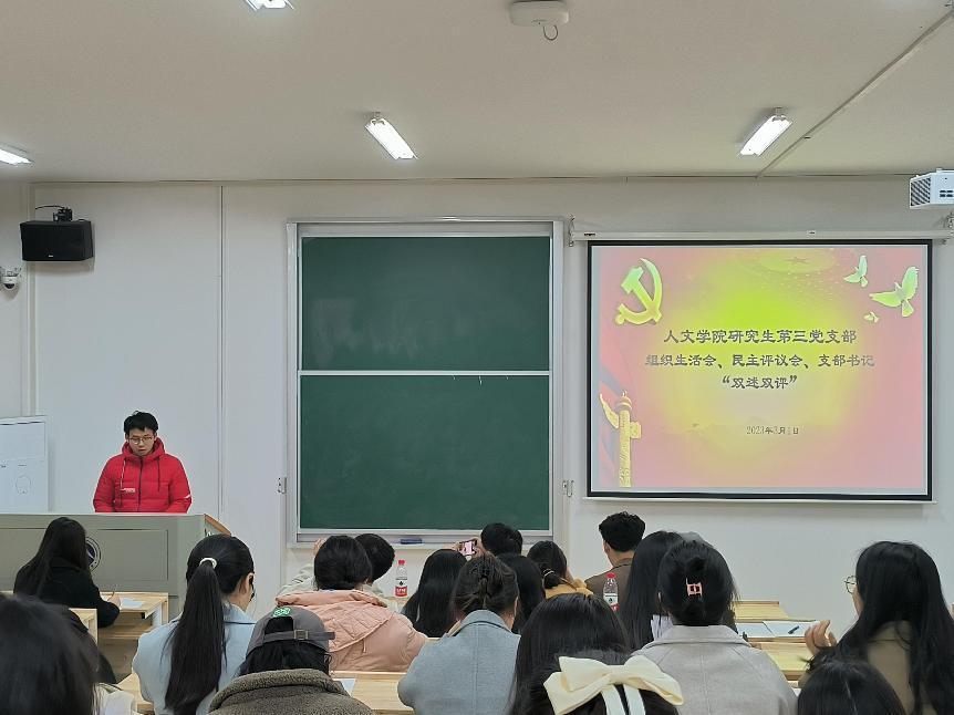 3月1日晚,人文学院研究生第三党支部组织生活会、民主评议会、支部书记“双述双评”会在我校雨湖校区2教101教室召开。人文学院党委委员、副院长袁星洁教授、第三党支部32位正式党员以及5位群众代表参加会议。