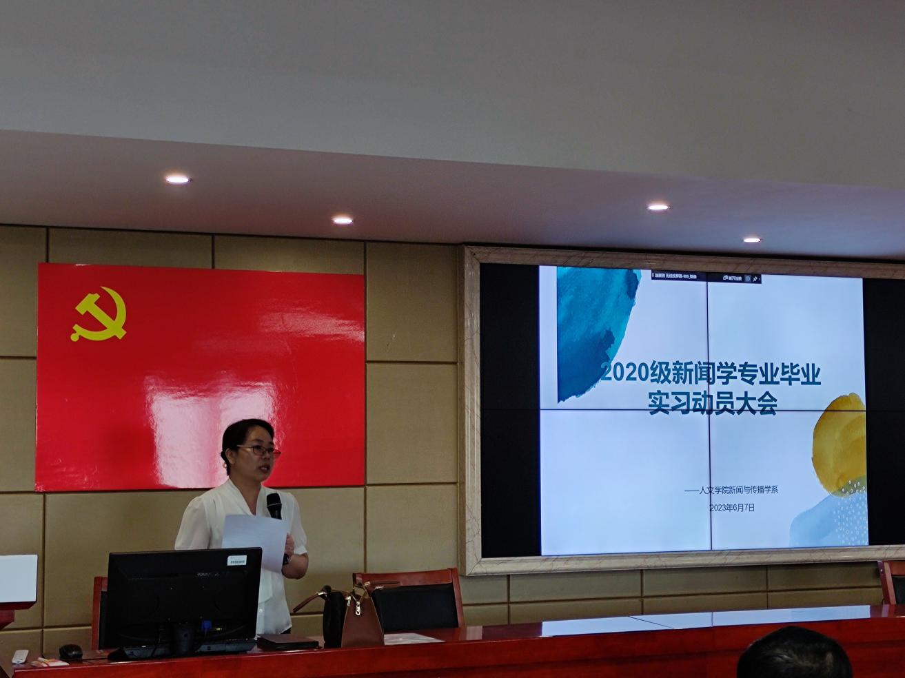 6月7日下午,我院2020级新闻学专业毕业实习动员大会于立言楼B4-1室顺利召开。本次大会由人文学院新闻系主办,人文学院副院长袁星洁,新闻系主任刘艳凤、副主任王超群、新闻系老师、20级本部及潇湘新闻专业学生参加本次会议,会议由刘艳凤主持。