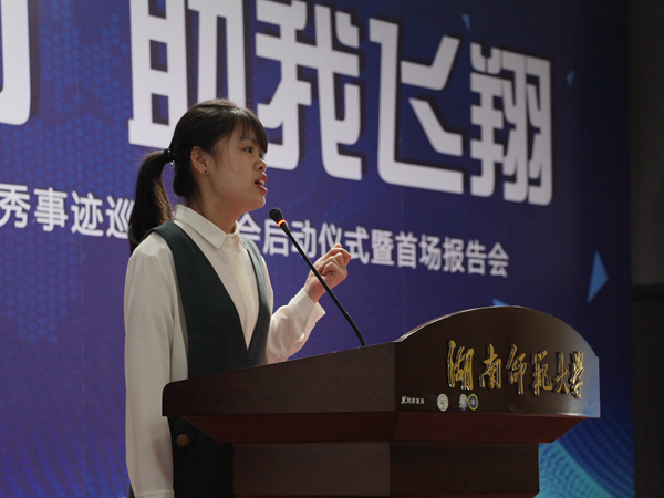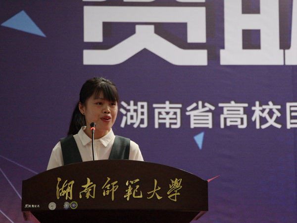 湖南科技大学15级汉语言专业吴玉容劈波斩浪经过层层选拔,成为首次报告会五位报告人之一,向在场的包括湖南中医药大学、湖南商学院、湖南财政经济学院、湖南第一师范学院、湖南涉外经济学院、长沙医学院、湖南师范大学在内的7所高校的老师、学生代表讲述自己的成长经历、奋斗历程。