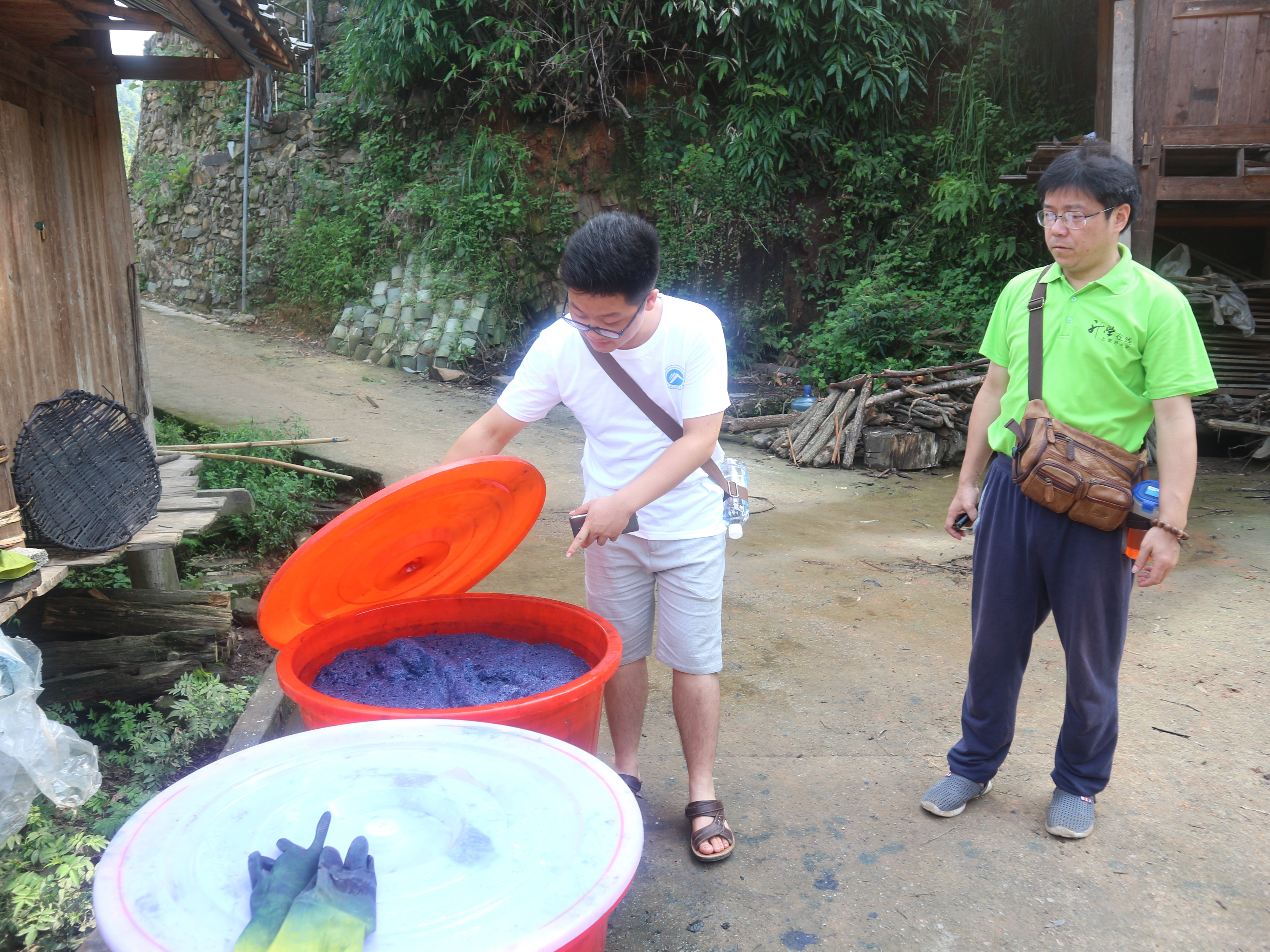(图为人文学院研究生暑期科技服务团成员在仔细观察靛蓝染缸)