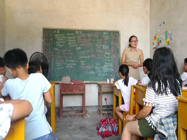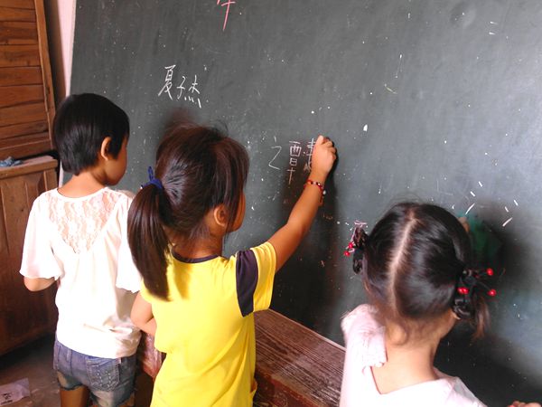 上课哨声吹响,低年级孩子们端端正正地坐在座位上,教室的墙上,贴着孩子们折的五颜六色的千纸鹤和心愿卡。美术课上,幼儿班的孩子当起了“小老师”,在黑板上一笔一划地写着自己的名字、用彩色粉笔仔细地画着房子、小女孩、蝴蝶等等;针对二、三年级的孩子们拼音知识薄弱的问题,志愿者叶甜用不同颜色的粉笔在黑板上标明不同种类的英语单词,并用童谣标写拼音,让孩子们更好地认识和学习水果,数字,月份,四季等不同的英语表示方法;音乐课上,黑板上写着密密麻麻的歌词,孩子们模仿老师的发声和旋律,一遍一遍地练习着《宁夏》:“宁静的夏天,天空中繁星点点……”师生一道度过的夏日,仿佛不再是聒噪和闷热,更多地是难得的清凉和宁静。