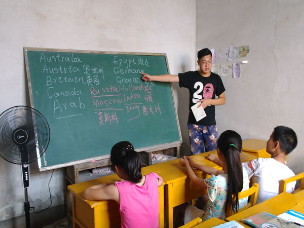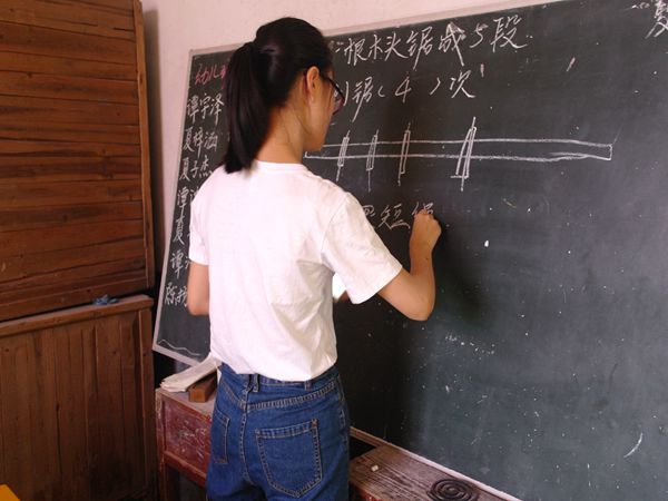 “希腊诸神之使神墨丘利,有一次在尼罗河河畔散步,发现空龟壳中有一条干枯的筋,通过改造,弦乐器便从此诞生。”音乐课上,志愿者刘豪为初三学生讲授了乐理知识,并着重地解释了历史和神话故事中的乐器起源。孩子们被神秘的传说深深吸引,都瞪大了眼睛,专注地看着老师。“学而不思则罔,思而不学则殆。”志愿者周雨凡一边朗读,一边在黑板上工整地书写,用红色粉笔重点标记通假字、易考字词,并严谨地翻译《论语》的部分篇章。志愿者李基豪结合历史、地理常识,教以孩子们关于国家的英语单词。