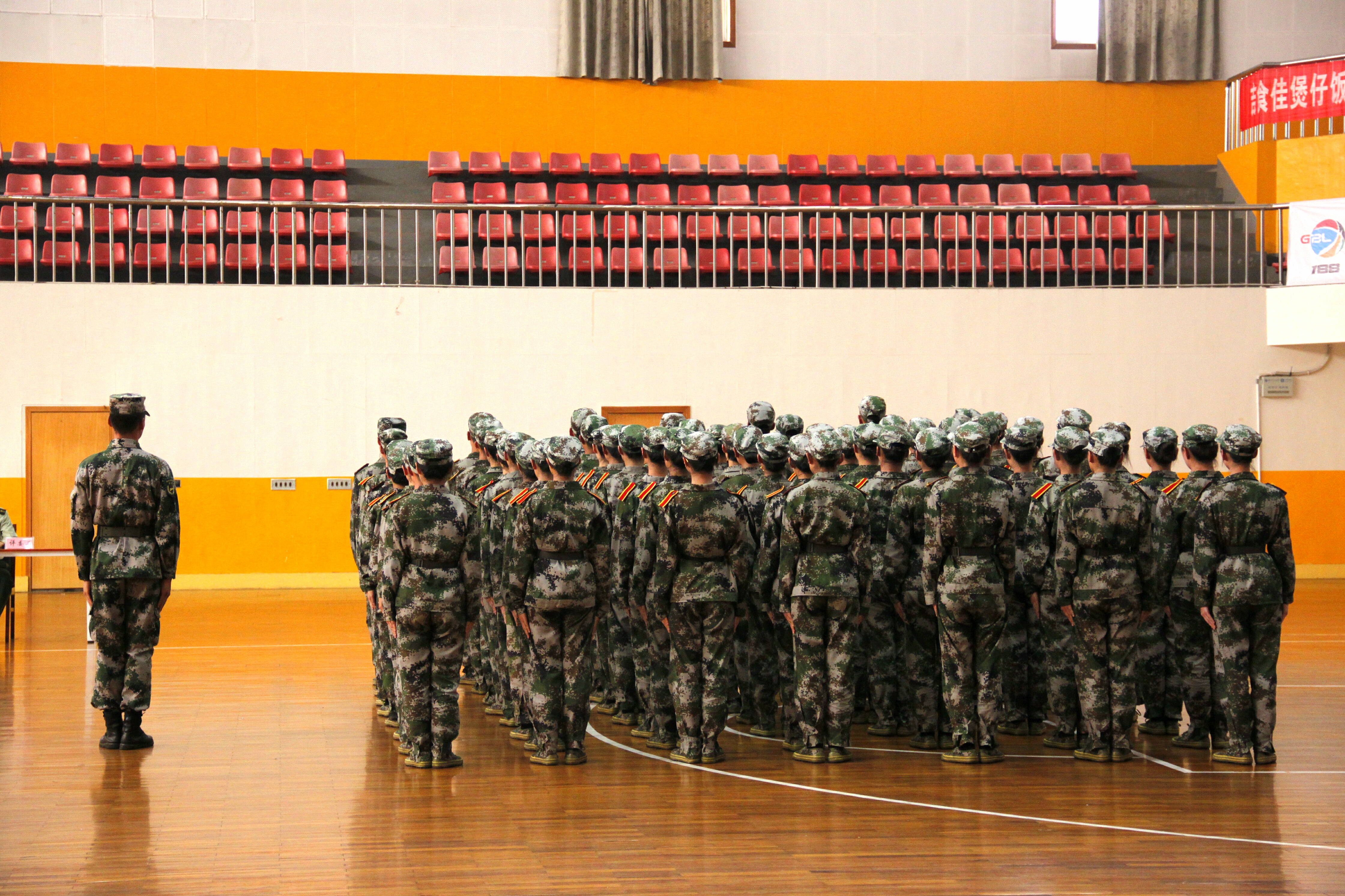 据悉,为保证比赛的客观公正,此次队列会操评比采取抽签的形式,并在评比结束之后公布各个学院的出场顺序。我院作为第三个出场的学院,学员们整装待发。北校篮球馆外,我院方阵队在尹教的带领下早早来到篮球馆外集结完毕,身穿迷彩服的方阵队成员们个个精神抖擞,表情严肃,在教官雄浑嘹亮的口号声中,步调一致地走进体育馆内。新生们整理着装,检查腰带,还不时互相检查军容,为这场队列会操评比做最后的准备。