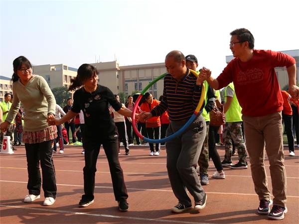 接到规程后,我院老师积极采取行动,充分做好了思想动员和落实工作,迅速组成了约30人的教职工队伍,抓紧训练,在田径场上一展风姿。比赛前,现场的老师们就开始进行如火如荼的准备工作。一声哨响后,比赛开始。首先进行的是教职工“蛟龙出海”比赛,各队队员排成一排,相邻队员腿部由透明胶带绑牢固,比赛开始后,各队队员集体前行。以全体成员躯干到达终点的顺序决定排名。各位教职工你追我赶,以百倍热情参与其中。接下来是教职工“快乐传递”比赛。教职工们互相勾住肩膀站成一排,将呼啦圈从队首第一个人传递至最后一个人,用时最短者获胜。老师们拉紧双手,凭借默契的配合达到最理想的比赛结果。最后进行的是教职工“同心协力”比赛,即跳长绳比赛,比赛八人一组,两人摇绳,六人齐跳。六人同时起跳开始计数,两分钟后结束。开赛前,队员们跃跃欲试,进行热身准备,并按身高排好位置,目不转睛地关注着摇绳队员的节奏。在“1、2、3……”的口号中,队员们竭力把握节奏。难免失误时,队员们也不灰心丧气,而是互相鼓励,在迅速稳定后,继续去适应团体的整体节奏,以合作互助诠释了“同心协力”。取得胜利的小队欢呼雀跃,拍手庆贺。教师们配合默契,你下我上,激烈有序,赛场上留下了教师们的飒爽英姿。