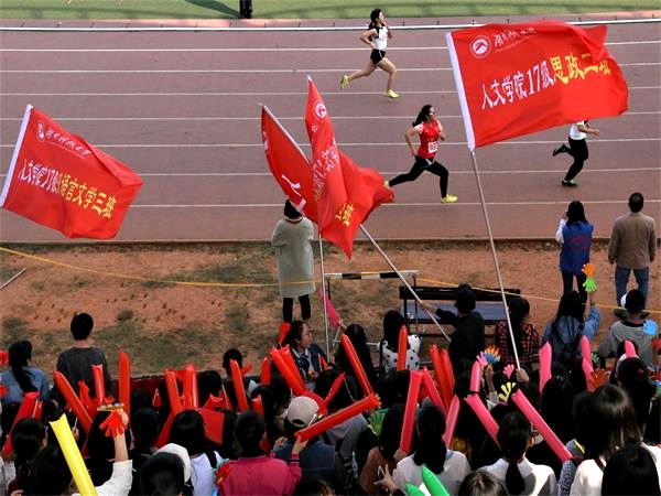 “人文,加油!春玲,挺住!”踏着节奏的点,在震耳欲聋的口号声中,人文学院的院旗齐齐应景地飘扬在观众席上空,台下正值女子3000米赛场终点处,这狂热喧天的阵势,皆为16级新闻二班的宋春玲。