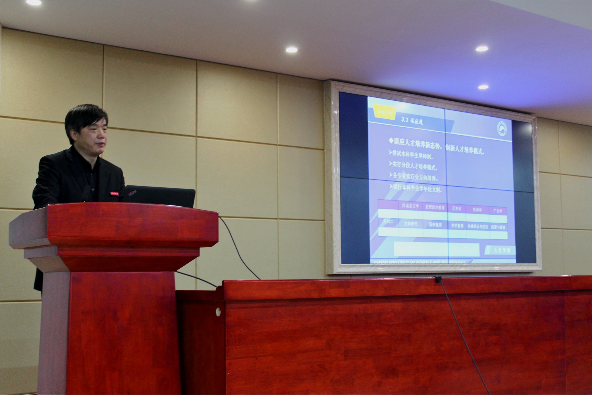 上午9时许,现场考察转移到立言楼B4-1报告厅,院长刘奇玉教授主持会议并做简要的汇报,院领导、相关系部负责人和教师代表近20人出席会议。刘院长首先简要阐述了人文学院的办学历程以及办学现状,学院的师资队伍以及定位与目标,他指出我院的办学类型是教学研究型,办学层次是本科教育为主,发展目标是特色鲜明的高水平教学研究型学院。3211工程、豆沙包工作室、黑蚂蚁传媒工作室、语言艺术团、隐山哲学社等学院优秀项目是学院坚持“守正创新”办学宗旨的重要体现。