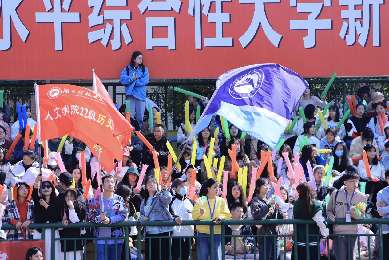 赛道外,人文学院观众席上的同学们更是热情洋溢,为赛道上的人文健儿们竭尽全力挥舞院旗,助威声、呐喊声不绝于耳,激情澎湃的声音将整个场面渲染的无比热闹。“我在奔跑的时候听到了大家的加油声,这些声音给了我极大的力量。”22级广告一班曾嘉瑶在比赛结束后非常兴奋激动,“加油,人文健儿们!尽力了就是最棒的!”