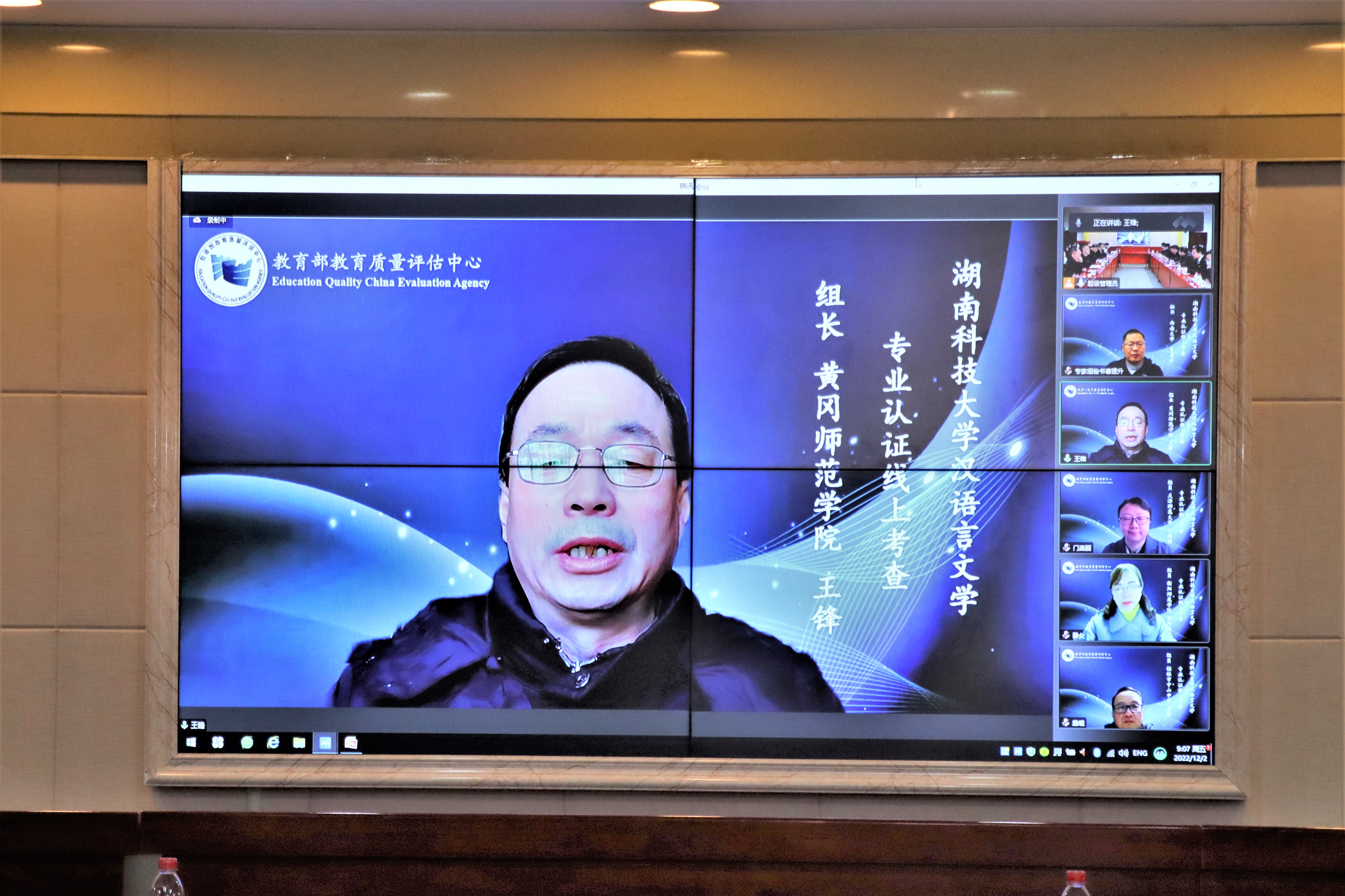 12月2日上午,人文学院汉语言文学师范类专业认证专家组反馈会于立功楼3-2会议室召开,认证专家就线上认证考查意见进行了反馈。湖南科技大学党委书记唐亚阳、副校长贺泽龙莅临本次会议。相关职能部门负责人、学校各师范专业负责人、人文学院负责人及中文系教师代表、承担汉语言文学专业基础课教学工作的相关学院教师代表出席现场会议,专家组成员以线上形式参会。本次会议由专家组组长王锋主持。