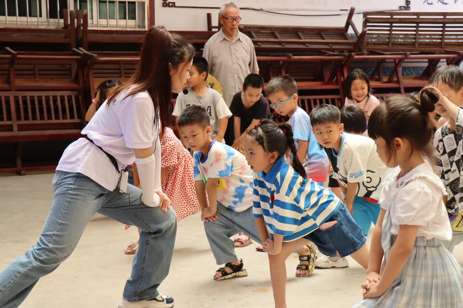 “来,同学们,跳舞之前我们要做什么呀?”龙杨慧举起手,示意学生们安静下来。“老师,要热身。”学生金传涛立刻喊道。龙杨慧随即带领学生们做起了热身操,学生们纷纷听老师的口令前后间隔一米排排站,而志愿者则站在风雨棚的大门口亲身示范,一步一个脚印跳起来儿歌舞蹈。