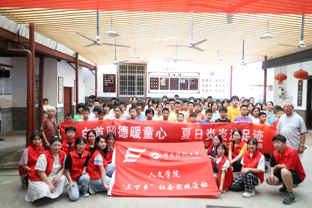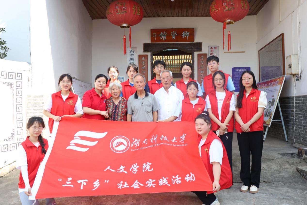 ▲湖南科技大学人文学院暑期“三下乡”社会实践团队与夏昭炎夫妇合照