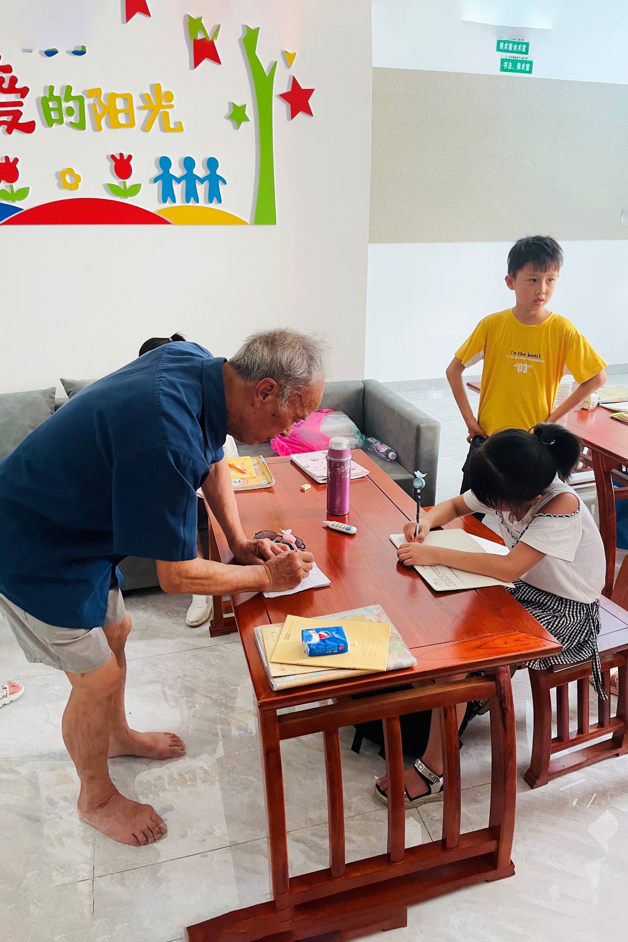 退休后,夏昭炎教授与杨莲金老师回到株洲攸县石羊塘镇老家,闲暇之余给小外孙辅导课业。“放一头牛,放两头牛,都是放牛;教一个孩子,教两个孩子,都是教孩子。”杨莲金老师说,“村里的留守儿童多,我和夏老师决定把孩子们聚集起来开一个班,一起辅导,并拓展他们的阅读量。"