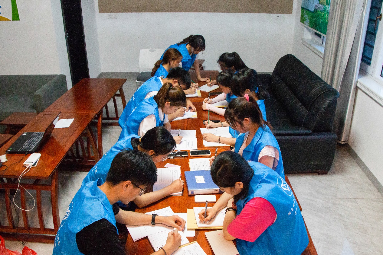 "嘀嘀、嘀嘀……",六点的闹铃一响,志愿者们迅速起床洗漱。早饭后,他们沿着两侧布满牵牛花、狗尾巴草的小道来到教学点。人文学院团委书记曾思妍说:“在昨天了解当地留守儿童、教学环境等情况之后,我们便组织开会为各个班级分配了班主任及科任老师,要求各位志愿者提前备课,以确保今天的的教学顺利进行,让留守儿童感受来自青年志愿者们的温暖与关怀。”