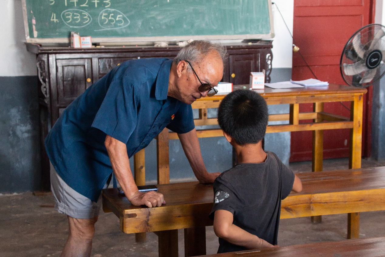 湖南科技大学人文学院退休的知名“赤脚教授”夏昭炎及其老伴杨莲金老师前往各个教室,为准备上课的志愿者提出教学建议,并在教室内等待留守儿童们的到来。“咻——咻——”随着口哨声吹响,第一节课正式开始,各教室传出一阵阵琅琅书声。