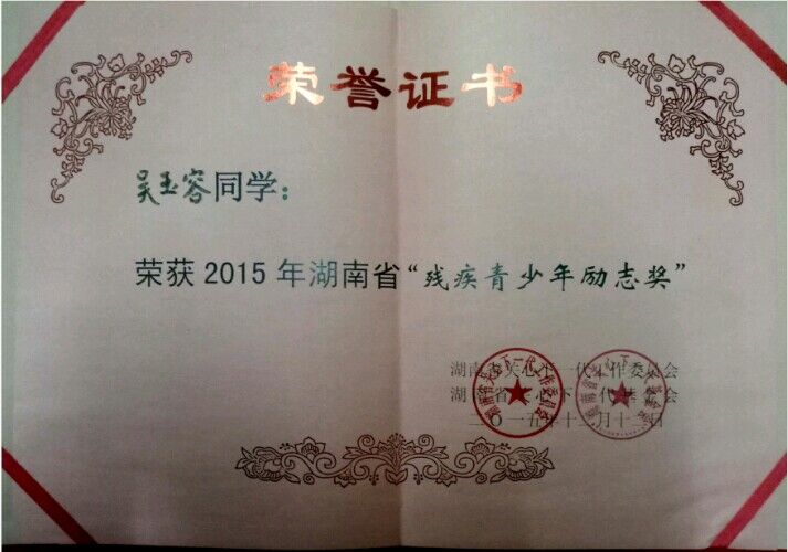 如今的她,已经是一名预备党员,近三年来,吴玉容获得了湖南省普通高校三好学生、湖南省残疾青少年励志奖、湖南科技大学优秀记者、湖南科技大学优秀共青团员等奖励。此外,吴玉容还拿到了英语四六级、三级心理咨询师、普通话二级甲等、国家计算机二级等证书。目前已与合作团队成功申请了省级科研项目,同时也被学院推优参加2017年度寻访“中国大学生自强之星”活动。