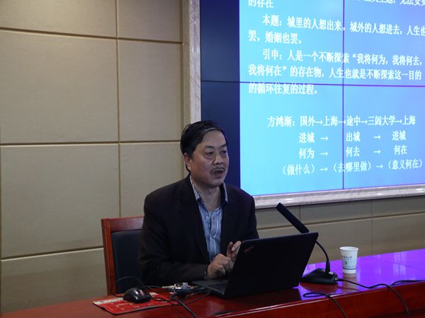 谈及《围城》,陈思广教授以主题为切入点,分别从浅主题与深主题两方面来讲解。他以人物形象方鸿渐为例,借由其故事详细介绍了浅主题涉及的三个点,即对腐败现象的讽刺;对中国传统文化的反省与批判,以及对现代人命运的思考。而对于《围城》的深主题,他认为主要是存在主义主题——无法安妥的存在,并强调了人生充满不确定性,总会有些偶然因素打破我们原先预定好的计划。同时,陈教授表示《围城》的思想魅力就在于对社会、对人生的深刻探讨。