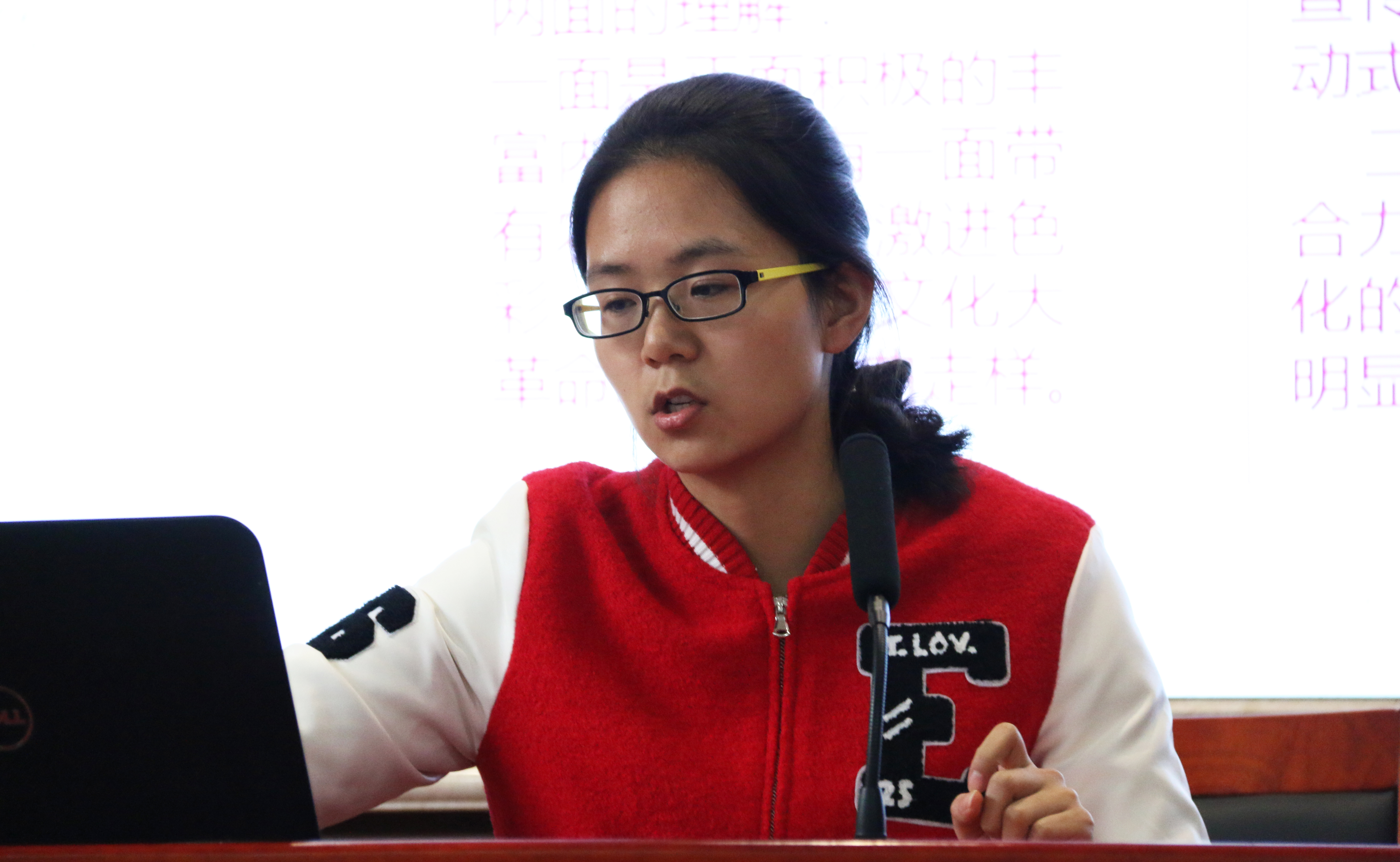 报告会现场,来自湖南大学、中南大学和湖南科技大学的七位研究生同学先后对自己的报告进行讲解。“红色在中国人眼中是祥瑞之兆,尚红是中国的传统。”中南大学马克思主义研究生杨柳在本次报告会上对中国的红色文化进行深入讲解,首先介绍古今中外对红色文化的不同理解,着重讲解红色文化的产生、现实困境以及其当代价值。从五四新文化运动时期红色文化的产生到讲述红色文化在当代对教育、文化、精神的影响及价值,其每个方面都有独特的见解。杨柳在报告最后用自己的一句话鞭策在场的学生:“理想若星辰,红星照我去战斗;信念如长风,直挂云帆济沧海。” 文化的创新是在不停地反思与继承中进行的,我们应不断反思自己不断创新发展。