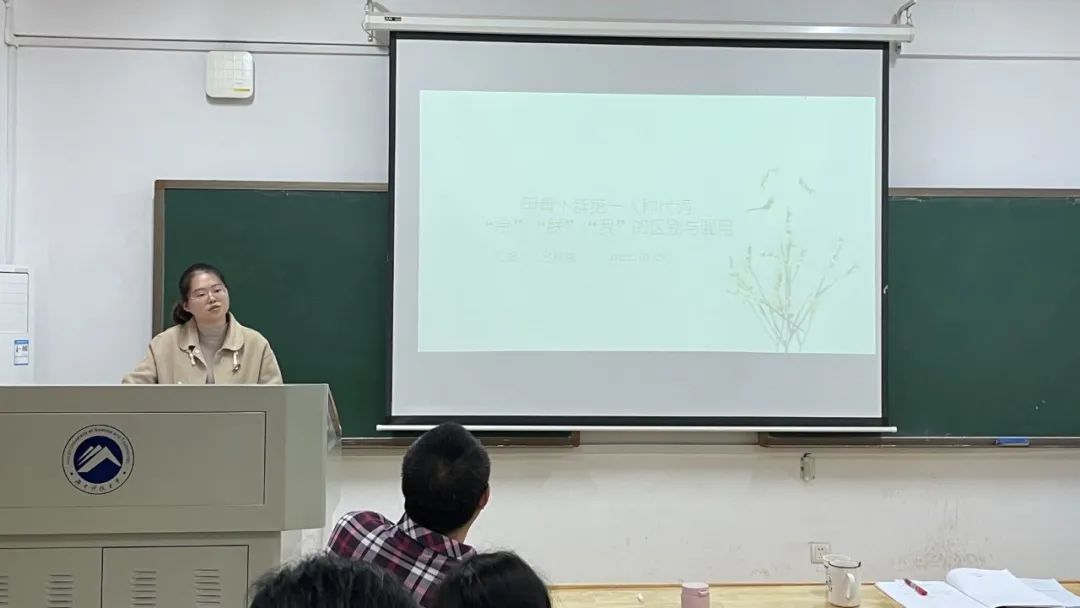 彭欣以《量词“具”的起源及历史演变》为汇报主题,徐前师老师认为可以进一步关注“具”做量词时,称量的事物本身有哪些特点以及适用于哪些场合,由此拓展研究深度。